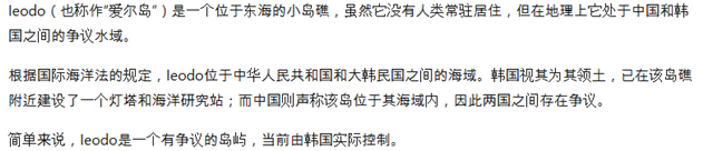 Ieodo(¿¡ÀÏ ¼¶À̶ó°íµµ ÇÔ)´Â µ¿ÇØ¿¡ À§Ä¡ÇÑ ÀÛÀº ¼¶°ú ¾ÏÃÊ·Î, »ç¶÷ÀÌ »óÁÖÇÏÁö´Â ¾ÊÁö¸¸ Áö¸®ÀûÀ¸·Î Áß±¹°ú Çѱ¹ »çÀÌÀÇ ºÐÀï ¼ö¿ª¿¡ ÀÖ½À´Ï´Ù. (Áß·«) Çѱ¹Àº ÀÚ±¹ÀÇ ¿µÅä·Î °£ÁÖÇÏ¿© ÀÌ ¼¶°ú ¾ÏÃÊ ±Ùó¿¡ µî´ë¿Í ÇØ¾ç ¿¬±¸¼Ò¸¦ °Ç¼³Çß½À´Ï´Ù. ¹Ý¸é Áß±¹Àº ÀÌ ¼¶ÀÌ ÀÚ±¹ ÇØ¿ª¿¡ ÀÚ¸® Àâ°í ÀÖ´Ù°í ÁÖÀåÇϰí ÀÖ¾î ¾ç±¹ °£¿¡ ºÐÀïÀÌ Á¸ÀçÇÕ´Ï´Ù. °£´ÜÈ÷ ¸»Çؼ, Ieodo´Â ÇöÀç Çѱ¹ÀÌ ½ÇÁúÀûÀ¸·Î ÅëÁ¦ÇÏ´Â ³íÀïÀÇ ¿©Áö°¡ ÀÖ´Â ¼¶ÀÔ´Ï´Ù.